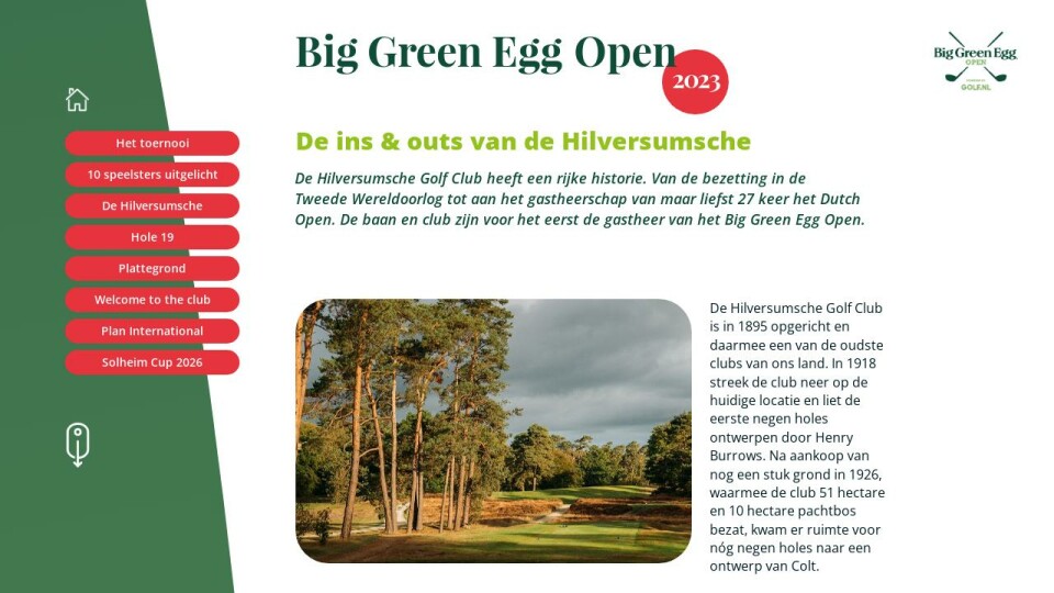 De Hilversumsche Golf Club heeft een rijke historie. Van de bezetting in de Tweede Wereldoorlog tot aan het gastheerschap van maar liefst 27 keer het Dutch Open. De baan en club zijn voor het eerst de gastheer van het Big Green Egg Open.