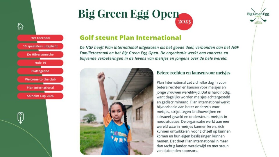 De NGF heeft Plan International uitgekozen als het goede doel, verbonden aan het NGF Familietoernooi en het Big Green Egg Open. De organisatie werkt aan concrete en blijvende verbeteringen in de levens van meisjes en jongens over de hele wereld.