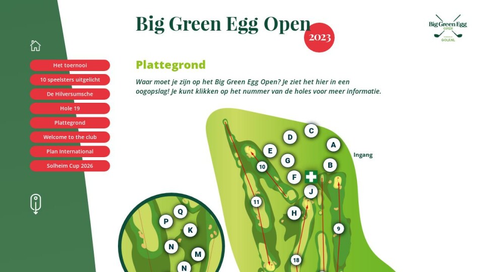 Waar moet je zijn op het Big Green Egg Open? Je ziet het hier in een oogopslag! Je kunt klikken op het nummer van de holes voor meer informatie.