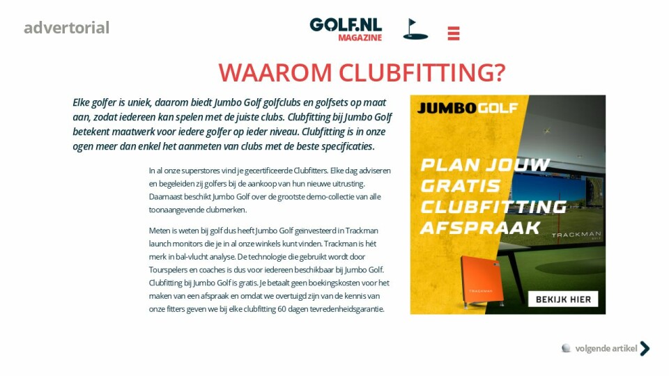 Meten is weten bij golf dus heeft Jumbo Golf geïnvesteerd in Trackman launch monitors die je in al onze winkels kunt vinden. Trackman is hét merk in bal-vlucht analyse. De technologie die gebruikt wordt door Tourspelers en coaches is dus voor iedereen beschikbaar bij Jumbo Golf. Clubfitting bij Jumbo Golf is gratis. Je betaalt geen boekingskosten voor het maken van een afspraak en omdat we overtuigd zijn van de kennis van onze fitters geven we bij elke clubfitting 60 dagen tevredenheidsgarantie.