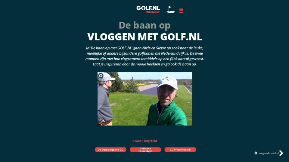 In 'De baan op met GOLF.NL' gaan Niels en Sietse op zoek naar de leuke, moeilijke of andere bijzondere golfbanen die Nederland rijk is. De twee mannen zijn met hun vlogcamera inmiddels op een flink aantal geweest. Laat je inspireren door de mooie beelden en ga ook de baan op.